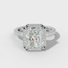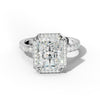 The Violet Engagement Ring features a striking radiant-cut center stone surrounded by a pave-set halo and accent stones. This expertly crafted design enhances the ring's brilliance and sparkle, offering a timeless yet sophisticated choice for a memorable engagement. Its precise cut and delicate detailing ensure exceptional fire and elegance from every angle.